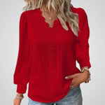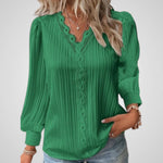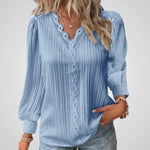 Γυναικεία μπλούζα V-λαιμόκοψη με δαντελένια λεπτομέρεια και μακριά puff μανίκια. Αυτή η μπλούζα διαθέτει μια κολακευτική V-λαιμόκοψη διακοσμημένη με λεπτή δαντέλα, κομψά μακριά puff μανίκια και μια χαλαρή, πλισέ εφαρμογή για απόλυτη άνεση και στυλ. Ιδανική για ντύσιμο είτε για επίσημες είτε για πιο casual περιστάσεις.