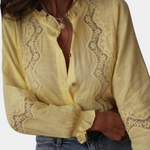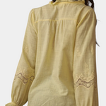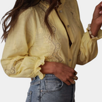 Άφησε τον ήλιο να μπει με τη Μπλούζα Δαντέλας Catarina, μια ρομαντική μίξη απαλής θηλυκότητας και γοητευτικής μποέμ αισθητικής. Αυτό το κομμάτι ονείρου διαθέτει λεπτεπίλεπτα πάνελ δαντέλας, ελαφρώς φουσκωτά μανίκια και ένα κολακευτικό κουμπωτό μπροστινό μέρος. Ο ζεστός κίτρινος τόνος φωτίζει την εμφάνισή σου ενώ η περίπλοκη κεντητική προσθέτει μια δόση vintage ψυχής.