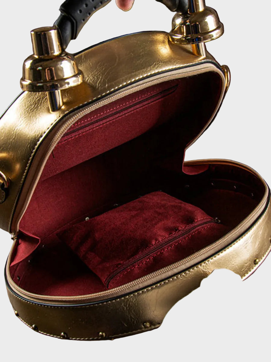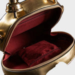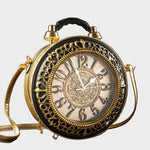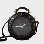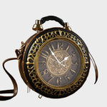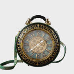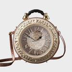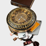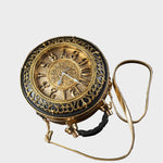 Βήμα σε μια άλλη εποχή με την Τσάντα Χρονοφύλακας, όπου η μόδα συναντά τη φαντασία. Δημιουργημένη για να μοιάζει με ένα vintage ρολόι τσέπης, αυτό το statement κομμάτι διαθέτει ένα πλήρως λειτουργικό ρολόι ενσωματωμένο στο κυκλικό σώμα του, πλαισιωμένο από περίτεχνα μεταλλικά στοιχεία και λεπτομέρειες εμπνευσμένες από την αντίκα.