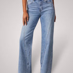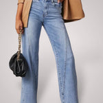 Αυτό το φαρδύ τζιν σε μπλε denim έχει σχεδιαστεί για να αναδεικνύει τη σιλουέτα σας χάρη στις δομικές ραφές του και τη μοντέρνα του γραμμή.