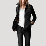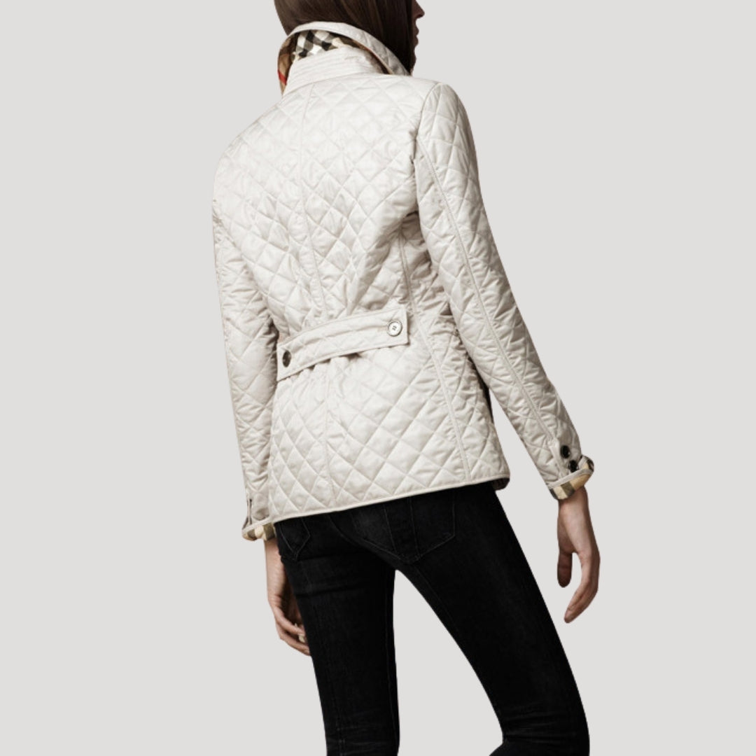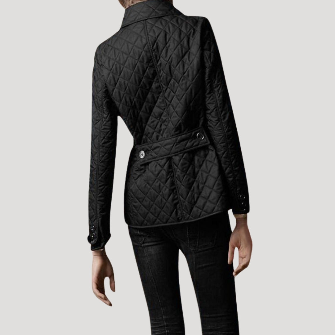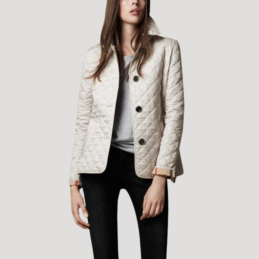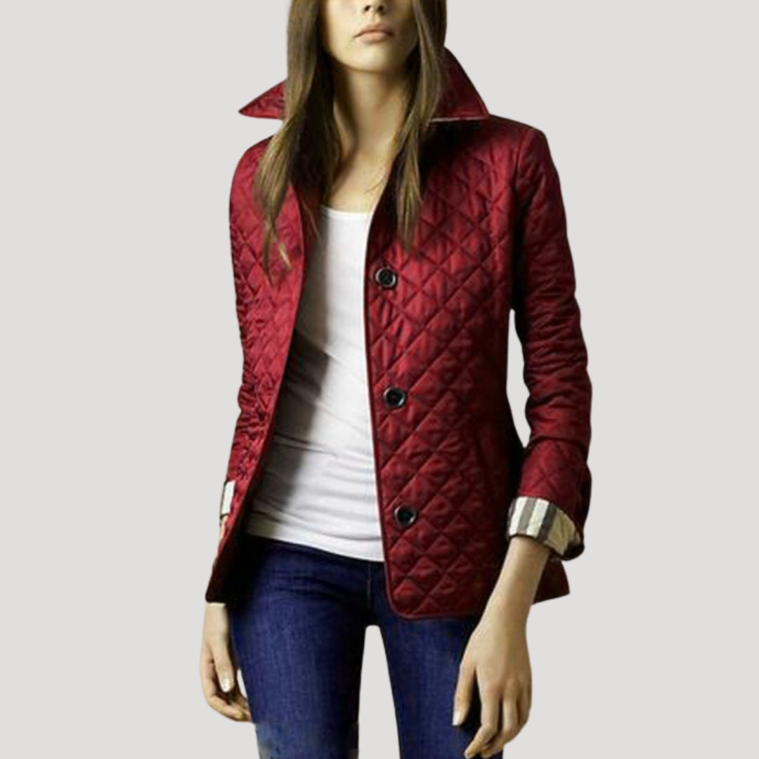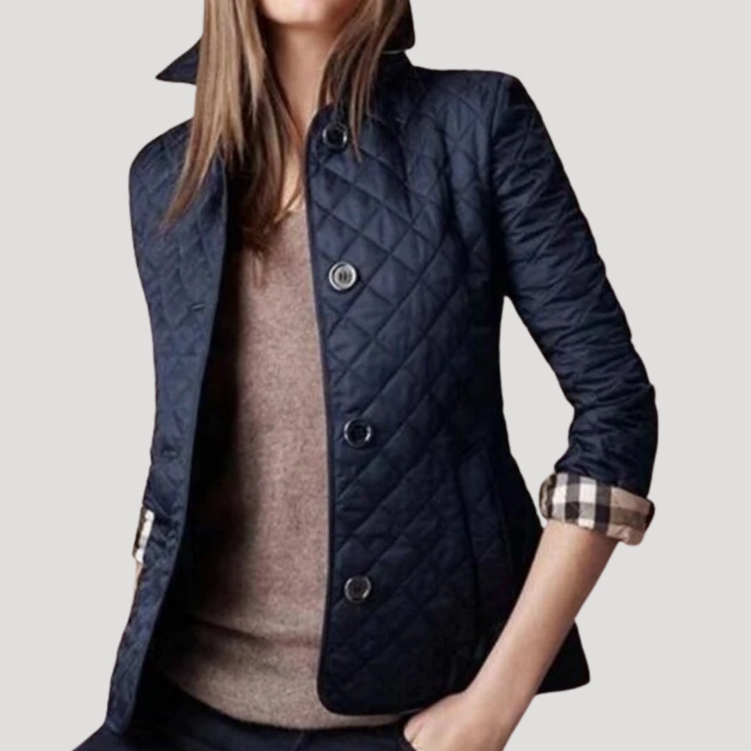 Γυναικείο μπουφάν με επένδυση και κομψή σιλουέτα, διακοσμημένο με διαμαντένια ραφή. Ελαφριά επένδυση σχεδιασμένη για να προσθέτει μόνωση χωρίς περιττό όγκο. Κλείσιμο με κουμπιά μπροστά και δομημένος γιακάς. Κατασκευασμένο από αναπνεύσιμο ύφασμα. Ιδανικό ως ελαφριά εξωτερική στρώση για τις ανοιξιάτικες μέρες και τις πιο δροσερές βραδιές, κατάλληλο για casual και smart-casual ντυσίματα. Σχεδιασμένο για να φοριέται πάνω από ένα πουλόβερ με τζιν.