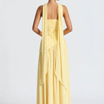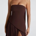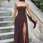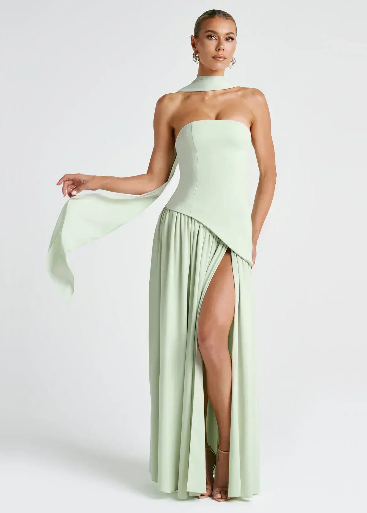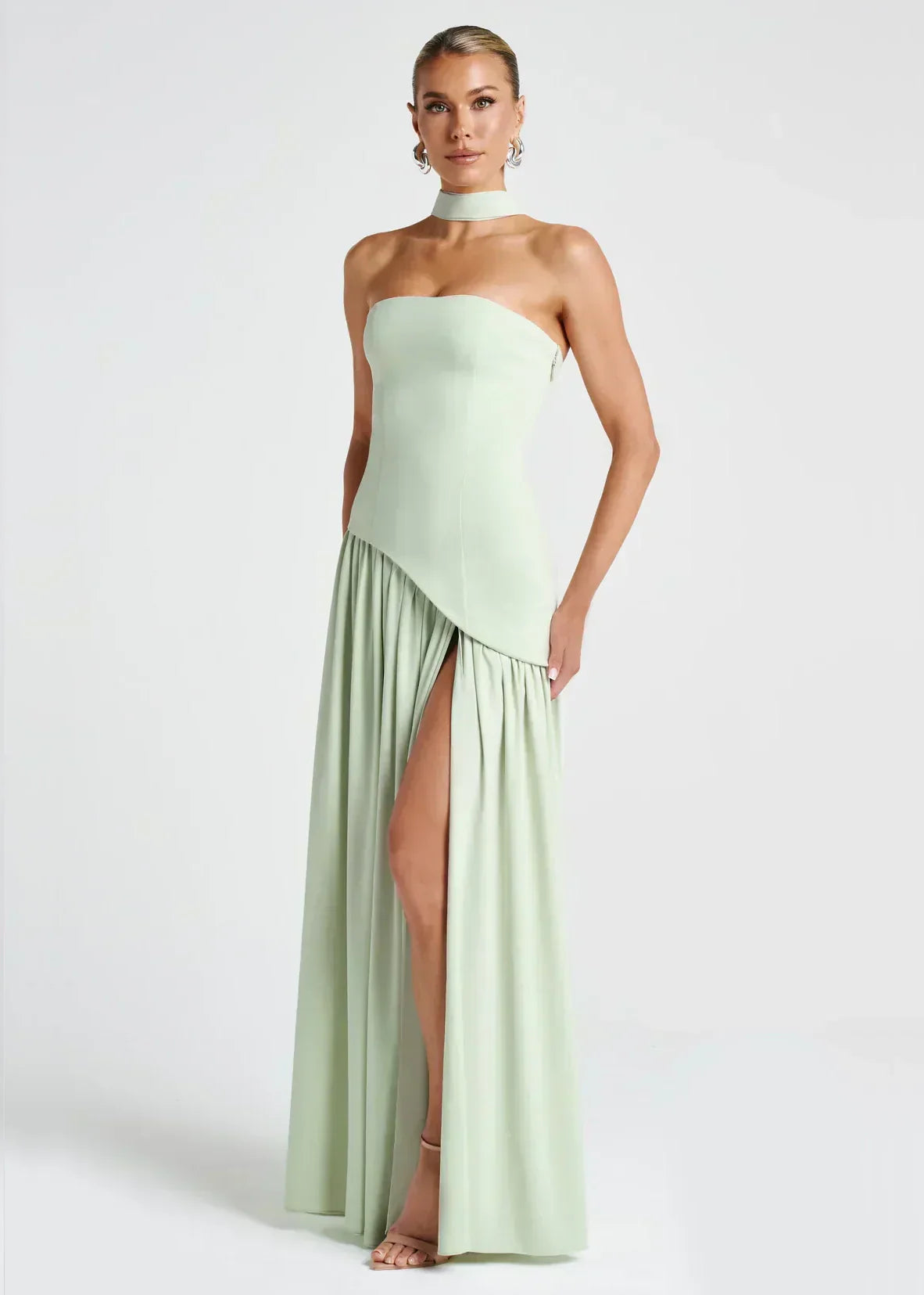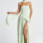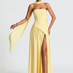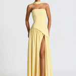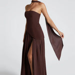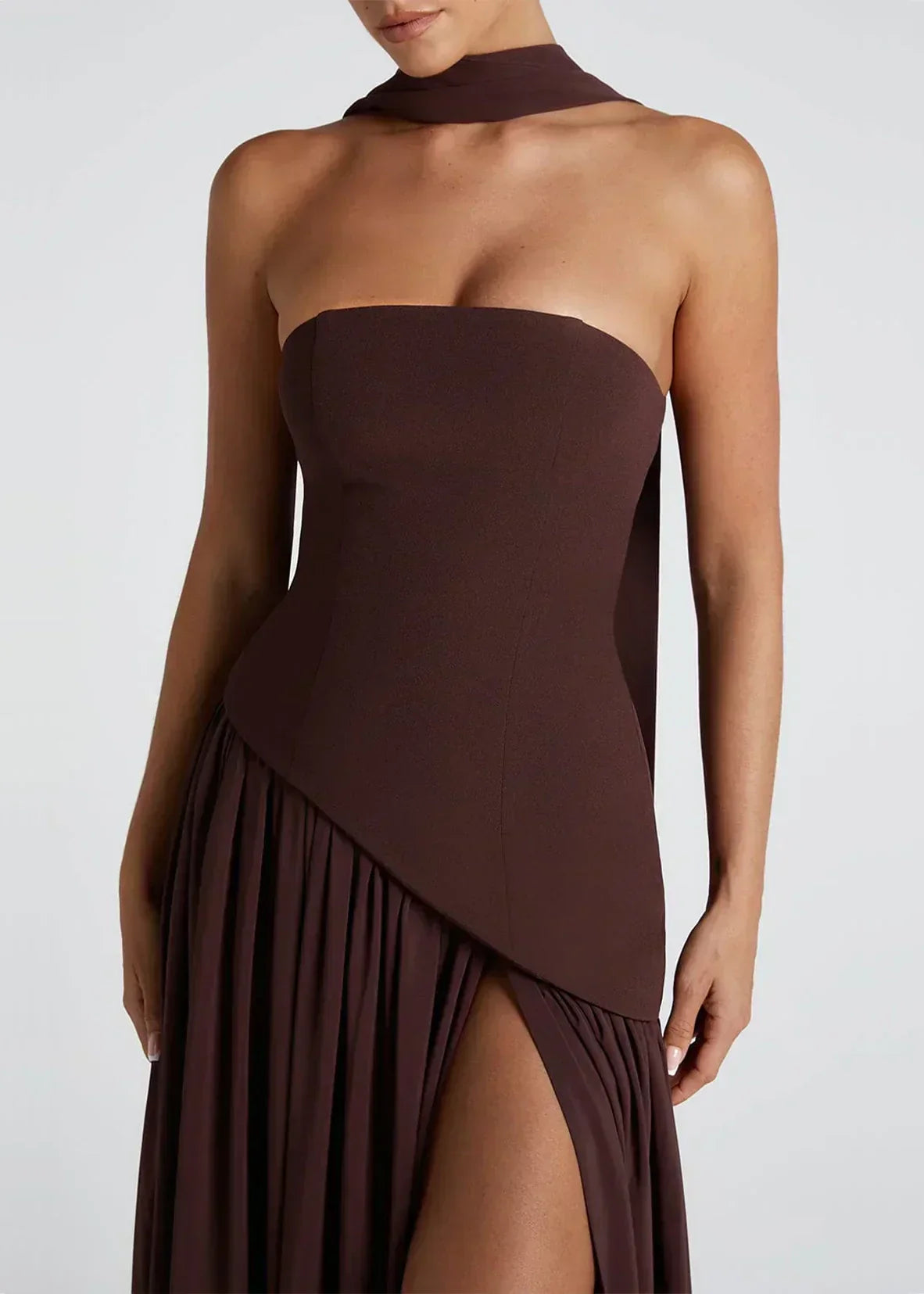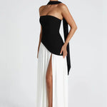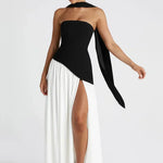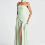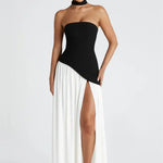 - Λεπτομέρειες: Ασύμμετρη μέση, ψηλό σκίσιμο, προσαρτημένο choker