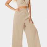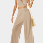 Ένα σχέδιο που έχει σχεδιαστεί για να ξεχωρίζει με χαλαρή κομψότητα. Το σετ Valentina συνδυάζει ένα κοντό τοπ από δαντέλα με ανοιχτή πλάτη και φαρδιά παντελόνια ψηλής μέσης, δημιουργώντας μια ρευστή και κομψή σιλουέτα. Ο λαιμός σε σχήμα V και οι γυναικείες λεπτομέρειες προσθέτουν μια ρομαντική αίσθηση, ενώ το ελαφρύ ύφασμα εξασφαλίζει δροσιά κατά τις πιο ζεστές ημέρες.