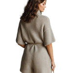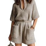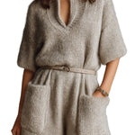 Ισα - Casual Ανοιχτό Καφέ Oversize Ρόμπα με Όρθιο Γιακά, Λαιμόκοψη V, Κοντό Μανίκι, Ζώνη, Εξωτερικές Τσέπες και Χνουδωτή Πλέξη (Casual Light Brown Stand Collar V-Neck Short Sleeve Belted Patch Pockets Oversize Fuzzy Knit Romper)