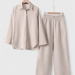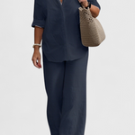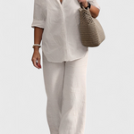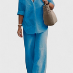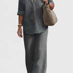 Το σετ Skye συνδυάζει τη δομημένη απλότητα με την καθημερινή άνεση. Κατασκευασμένο από ένα ελαφρύ μείγμα βαμβακιού και λινό, περιλαμβάνει μια μπλούζα με κουμπιά και χαλαρή γραμμή, καθώς και παντελόνια με ελαστική μέση που προσαρμόζονται απαλά στο σώμα. Μια λειτουργική πρόταση που ρέει ανάμεσα στο casual και το κομψό χωρίς προσπάθεια.