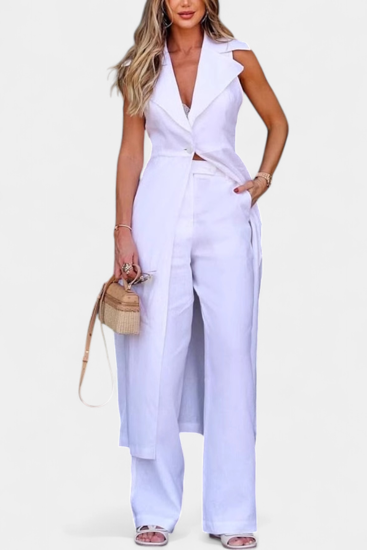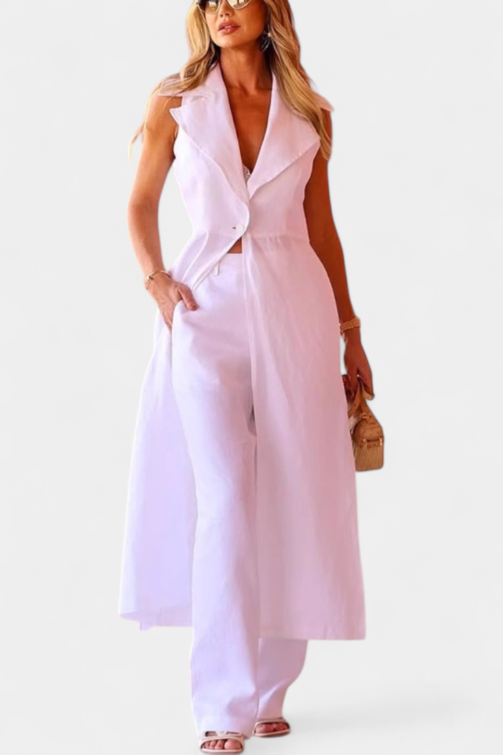 Το σετ Eider επαναστατεί την καλοκαιρινή κομψότητα με έναν μινιμαλιστικό και εκλεπτυσμένο σχεδιασμό. Το μακρύ γιλέκο χωρίς μανίκια, με κοπή σακακιού και μπροστινό κλείσιμο, συμπληρώνεται από ένα παντελόνι με ίσια γραμμή και απαλή πτώση. Η μονοχρωμία του σιλουέτας τονίζει χωρίς κόπο, ιδανικό για ζεστές μέρες με εκλεπτυσμένη πρόθεση.