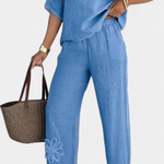 Μποέμ αισθητική με φυσική αίσθηση. Το σετ Natalia ξεχωρίζει για τη χαλαρή του σιλουέτα από μαλακό λινό, με ανάγλυφα λουλουδάτα κεντήματα που προσθέτουν μια τεχνίτη και θηλυκή αίσθηση.