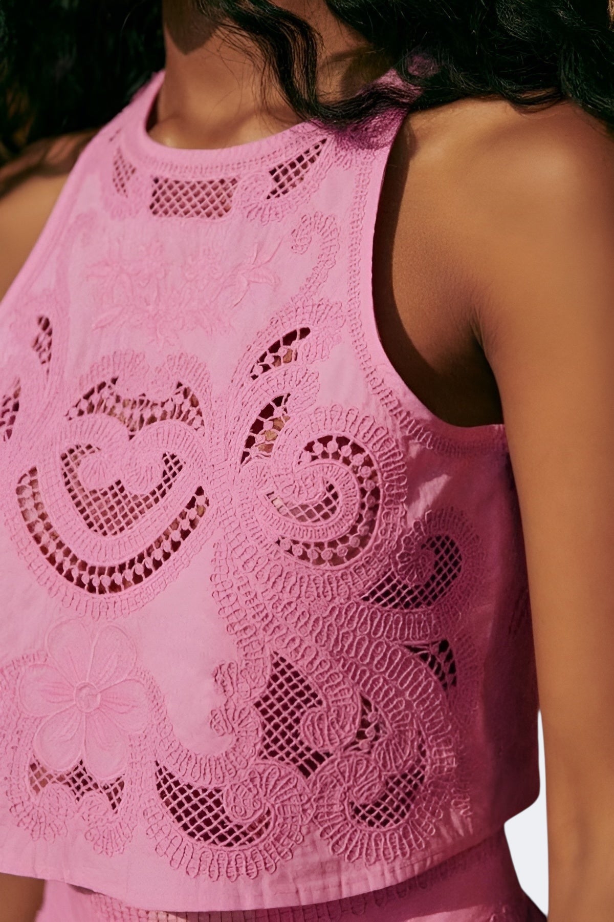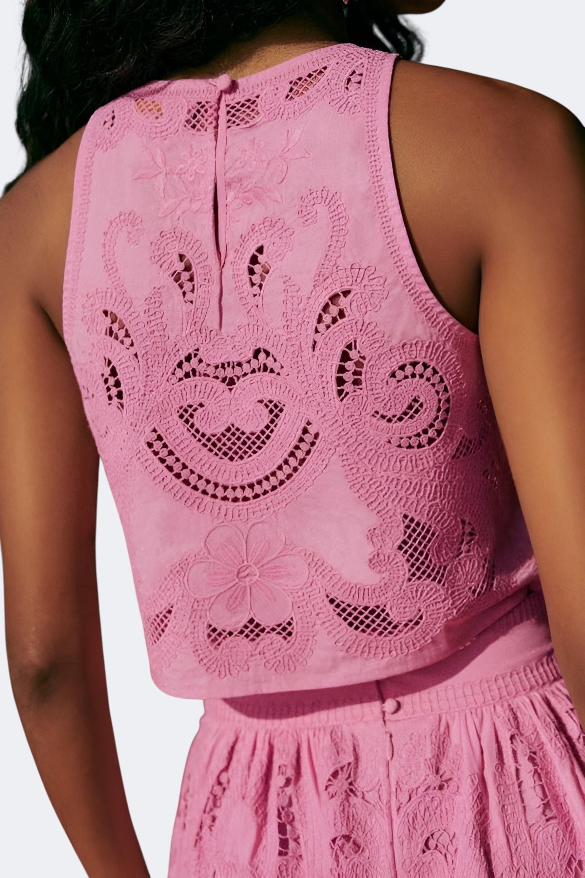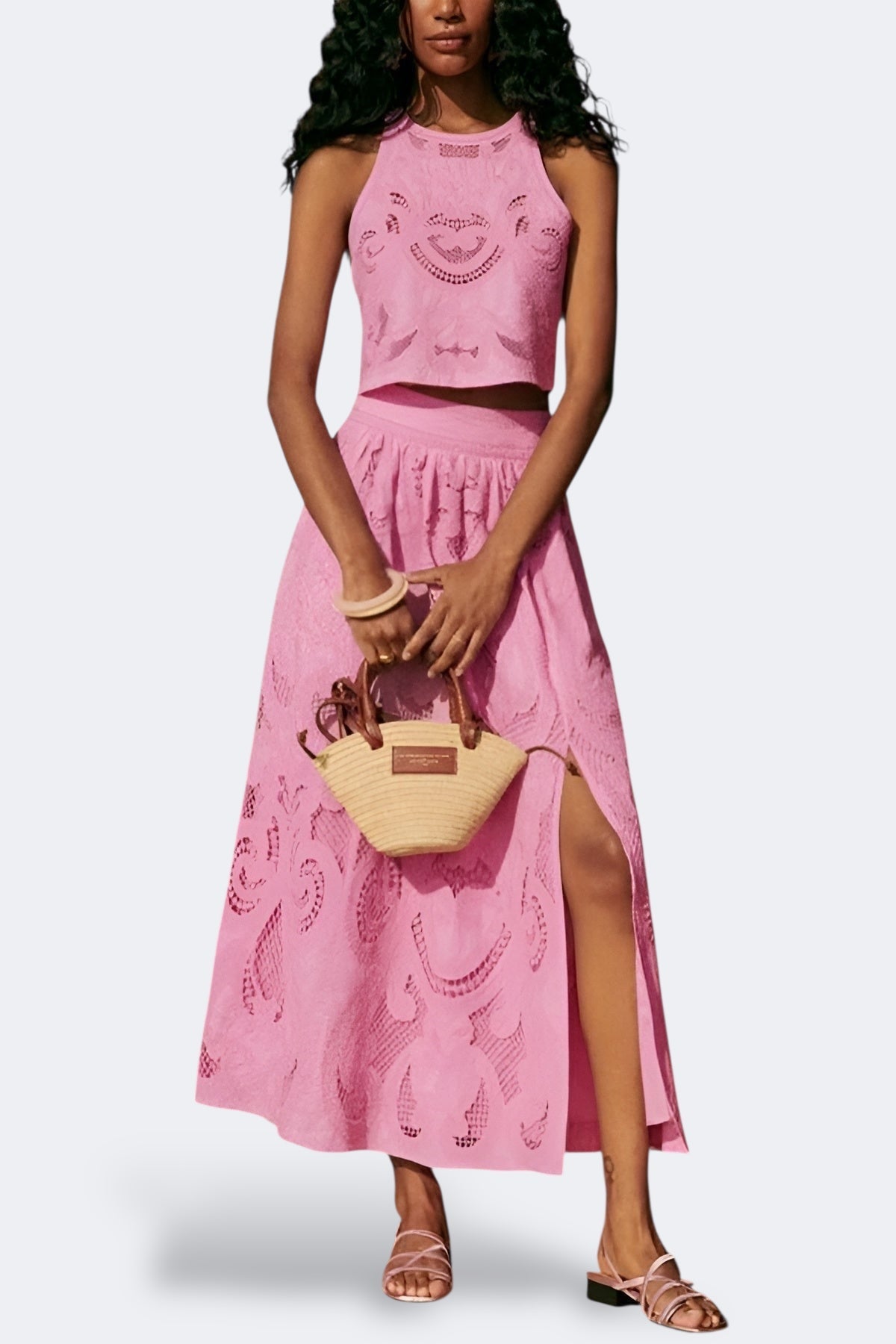 Κατασκευασμένο από μια λεπτή και ελαφρώς διαπνέουσα δαντέλα, ο ρευστός σχεδιασμός του προσαρμόζεται στις κινήσεις σου με χάρη. Ιδανικό για καλοκαιρινές βόλτες, brunch στον ήλιο ή ειδικές εκδηλώσεις, μπορείς να το φορέσεις ολόκληρο ή να συνδυάσεις τα κομμάτια σύμφωνα με την έμπνευσή σου της ημέρας. Θα είσαι το κέντρο των βλέμματων με απόλυτη φυσικότητα!