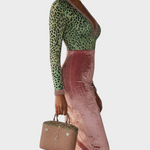 - Σχέδιο: Αυτό το midi bodycon φόρεμα συνδυάζει το color-blocking με την αντίθεση εκτύπωσης. Το πάνω μισό περιλαμβάνει V-λαιμόκοψη, μακριά μανίκια και λεοπάρ σχέδιο σε απαλές πράσινες αποχρώσεις, ενώ το κομμάτι της φούστας παραμένει σε σταθερό ροζ χρώμα. Η ανοιχτό ροζ διακόσμηση προσθέτει μια εκλεπτυσμένη διακοσμητική πινελιά γύρω από τη λαιμόκοψη και τους μανικέτες, ενισχύοντας τη συνολική αρμονία του σχεδίου.
