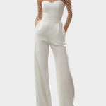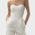 Tellie | Ολόσωμη Φόρμα σε Λευκό Χρώμα με Διαφάνεια στο Μπούστο και Διακόσμηση από Πέρλες (Pearl-Embellished Sheer Bodice White Jumpsuit)