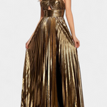 Το φόρεμα Αικατερίνη λάμπει με επιβλητική παρουσία χάρη στο μεταλλικό του ύφασμα, τον χιαστί λαιμόκοψή του και την μπροστινή του άνοιξη με στρατηγικά πτυχώσεις. Η φαρδιά σιλουέτα πέφτει με κομψότητα μέχρι τους αστραγάλους, δημιουργώντας μια αιθέρια κίνηση με κάθε βήμα. Ένα κομμάτι σχεδιασμένο για να ξεχωρίζει κάτω από τα φώτα και να αφήνει αποτύπωμα σε κάθε εκδήλωση.