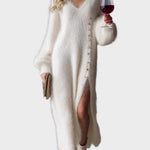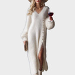 Βενετία | Άνετο, Κομψό Μίντι Πλεκτό Φόρεμα με V Λαιμόκοψη, Μεταλλικά Κουμπιά, Λευκή Απομίμηση Γούνας Κουνελιού και Σκίσιμο στο Πλάι