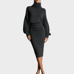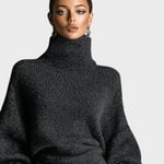 Ένα πλεκτό midi φόρεμα σε χακί απόχρωση με ψηλό λαιμό και oversized σιλουέτα. Είναι άνετο, στιλάτο και ιδανικό για δροσερές μέρες ή επίσημες casual περιστάσεις.