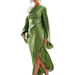 Αυτό το εντυπωσιακό πράσινο σατέν μάξι φόρεμα με έναν ώμο διαθέτει μια εντυπωσιακή ασύμμετρη γραμμή που εκπέμπει κομψότητα και μοντερνισμό. Κατασκευασμένο από πολυτελές σατέν, το ύφασμα προσφέρει μια λεία, γυαλιστερή εμφάνιση για μια εκλεπτυσμένη εμφάνιση και άνετη αίσθηση. Ο σχεδιασμός με έναν ώμο προσθέτει μια αίσθηση γοητείας, ενώ η ρέουσα ασύμμετρη γραμμή επιμηκύνει τη σιλουέτα. Ιδανικό για επίσημες περιστάσεις ή για να κάνετε μια κομψή δήλωση στο καθημερινό σας στυλ.
