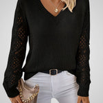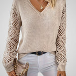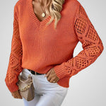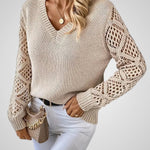 Γυναικεία Knit Πουλόβερ - V-λαιμόκοψη - Μακρυμάνικο - Ανοιχτό-Knit Λεπτομέρειες - Άνετη Εφαρμογή. Υιοθετήστε το αβίαστο στυλ με αυτό το πλεκτό πουλόβερ. Με μια κολακευτική V-λαιμόκοψη, μακριά μανίκια και εντυπωσιακές ανοιχτές πλεκτές λεπτομέρειες, αυτό το χαλαρό πουλόβερ προσθέτει μια πινελιά κομψότητας σε κάθε σύνολο, προσφέροντας άνεση και στυλ.