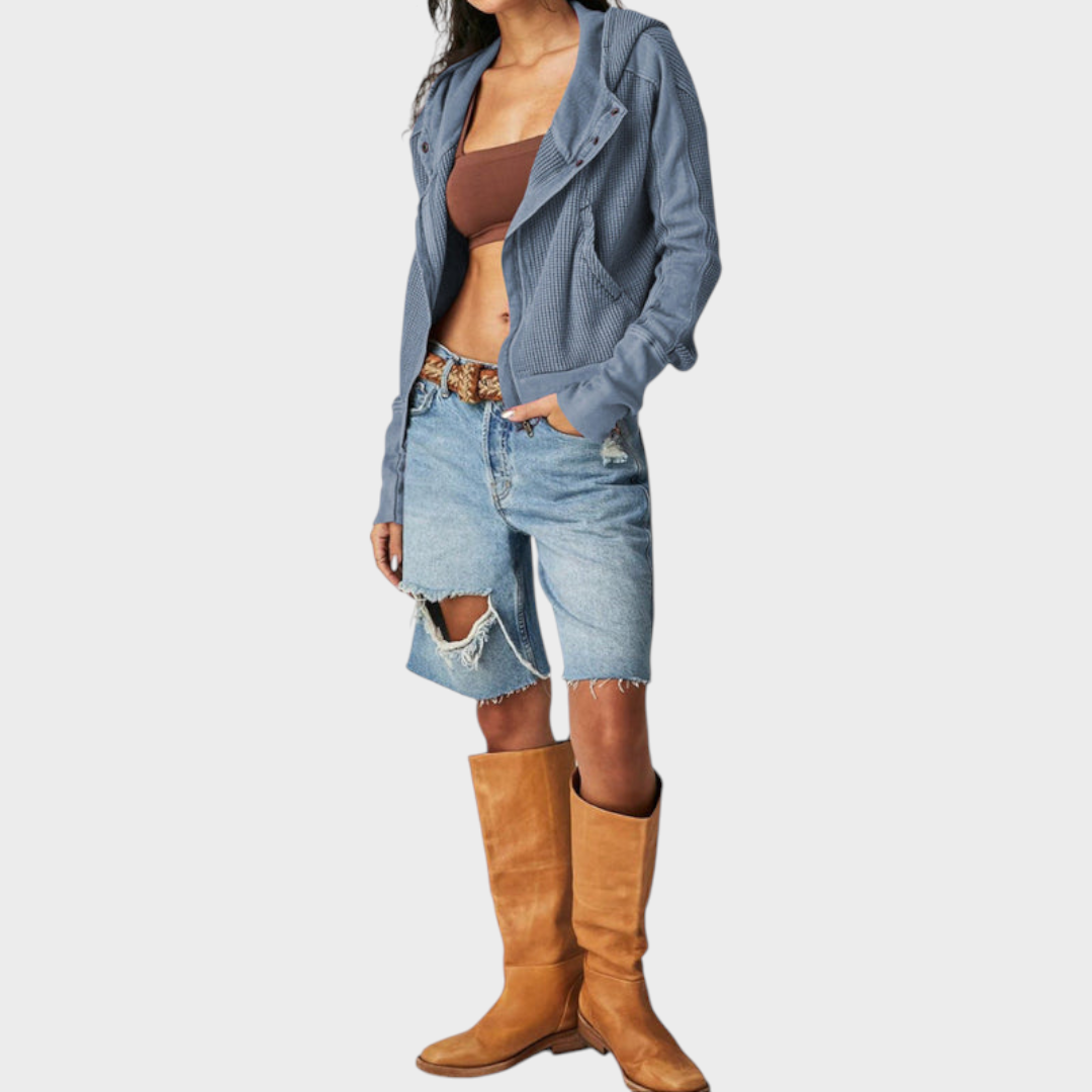 Αυτό το cropped φούτερ με πλέξη waffle προσφέρει μια χαλαρή, αβίαστα κομψή αίσθηση με την απαλή υφή και την εύκολη σιλουέτα του. Σχεδιασμένο να συνδυάζεται όμορφα, προσφέρει την κατάλληλη ισορροπία άνεσης και στυλ. Είτε το κλείσετε είτε το αφήσετε ανοιχτό, είναι ένα ευέλικτο κομμάτι που θα επιλέγετε ξανά και ξανά.