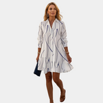 Το φόρεμα-πουκάμισο Theia συνδυάζει φυσική κομψότητα με άνετη εφαρμογή για μια εμφάνιση που παραμένει προσεγμένη από το πρωί έως το βράδυ. Η αέρινη γραμμή τύπου A αγκαλιάζει απαλά το σώμα χωρίς να πιέζει, προσφέροντας ελευθερία κινήσεων και μια κομψή σιλουέτα. Οι μοντέρνες κυματιστές ρίγες χαρίζουν μια δυναμική και καλλιτεχνική πινελιά, ενώ ο γιακάς με πέτο και τα κουμπιά ολοκληρώνουν το σύνολο με διαχρονικό στυλ. Ελαφρύ και αναπνεύσιμο, είναι ιδανικό για δραστήριες ημέρες όπου θέλετε να αισθάνεστε άνετα αλλά και κομψά.