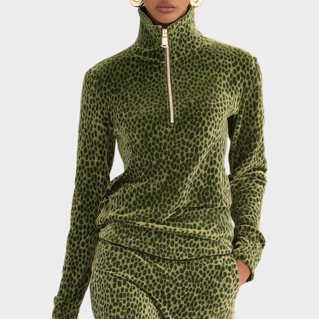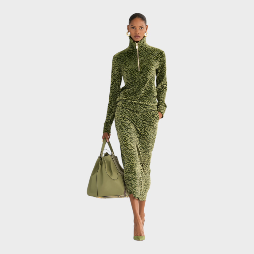 Το σετ βελούδινο τοπ με στάντ κολάρο και φούστα με λεοπάρ σχέδιο είναι ένα δυναμικό σύνολο που συνδυάζει αθλητικές επιρροές με τολμηρά, μοντέρνα στοιχεία. Το λεοπάρ σχέδιο προσθέτει μια εμβληματική και αιχμηρή αίσθηση, ενώ το βελούδινο ύφασμα προσφέρει μια αίσθηση πολυτέλειας και πλούτου, κάνοντάς το σετ να ξεχωρίζει. Το στάντ κολάρο στο τοπ προσφέρει μια αθλητική αίσθηση, που θυμίζει κλασικά αθλητικά ρούχα, και η συντονισμένη φούστα το συμπληρώνει τέλεια, δημιουργώντας μια συνεκτική εμφάνιση που μπορεί να μεταβεί ομαλά από casual εξόδους σε πιο κομψές περιστάσεις.